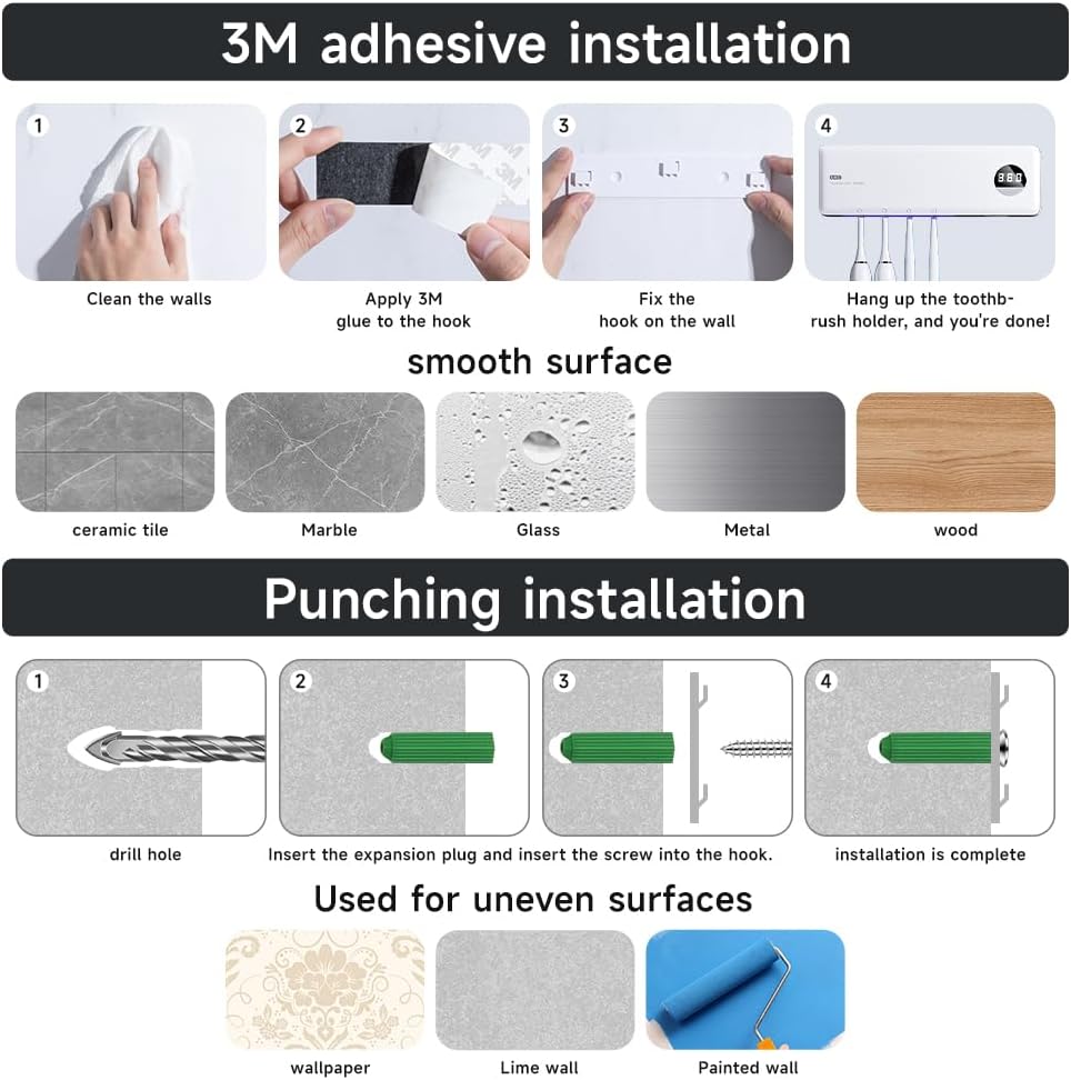 NO-DRILL MOUNTING: This toothbrush holder wall unit does not require any drilling and can be installed without an electrical outlet. It comes with a strong adhesive that adheres firmly to smooth, flat surfaces such as tile, mirror or stainless steel. For rough or painted walls, screws may be required for installation (included in the product package).