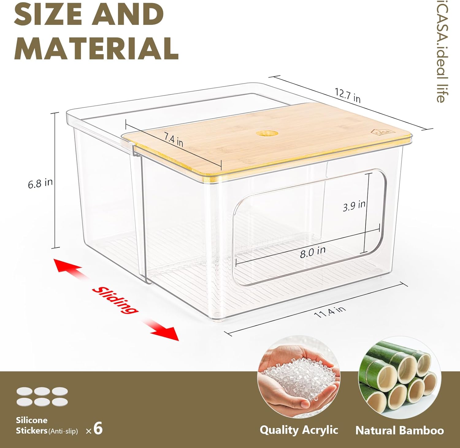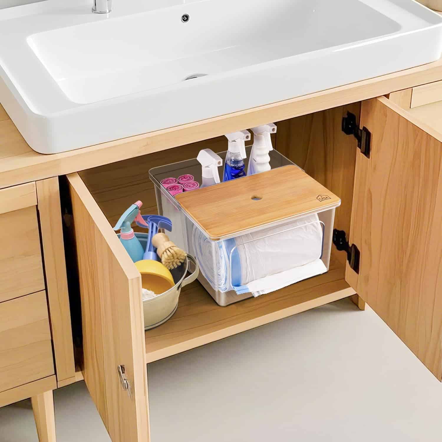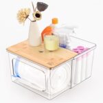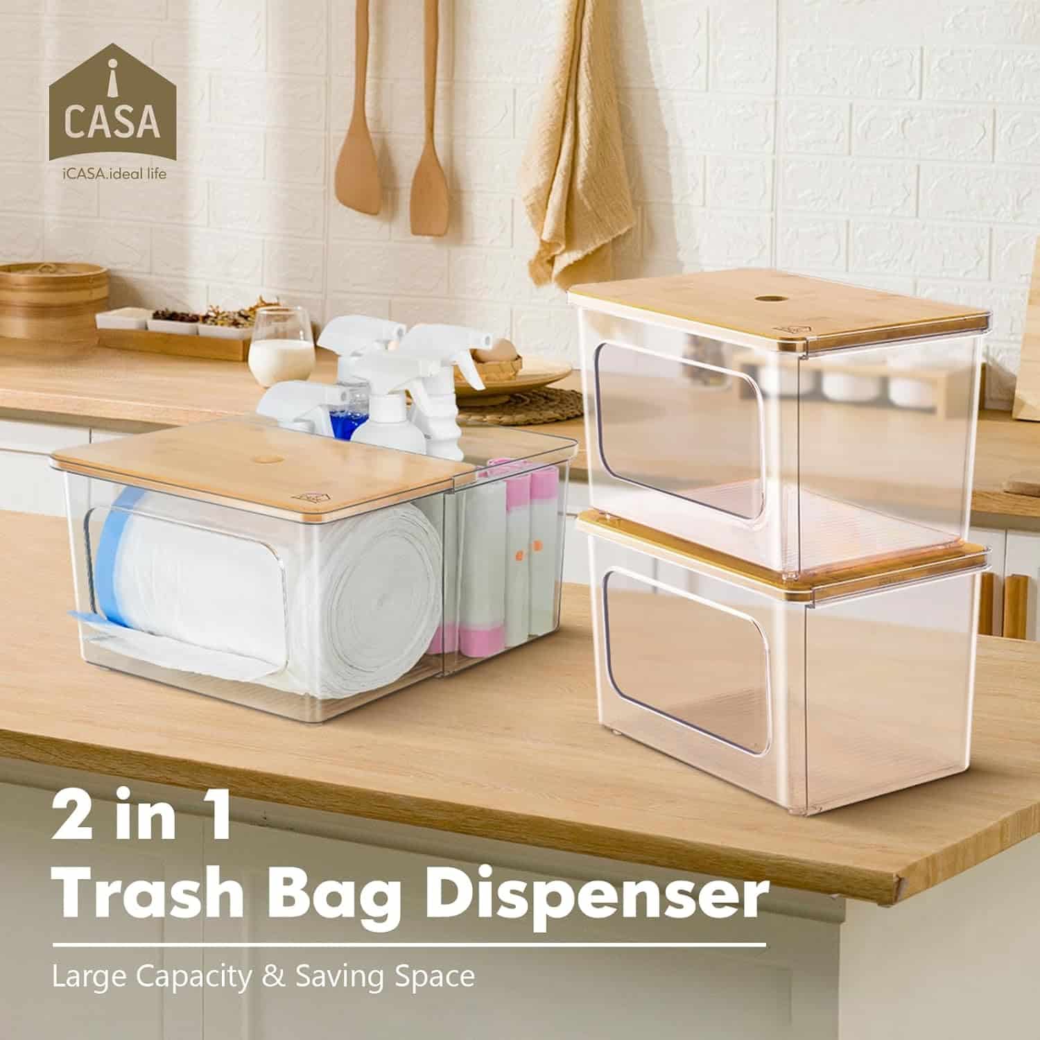 Trash Bag Dispenser Roll Holder – 2 in 1 Clear Acrylic Plastic Garbage Bags Container With Bamboo Lid Storage Box for Kitchen Pantry Laundry Room Organization Trash Bag Organizer Under Sink