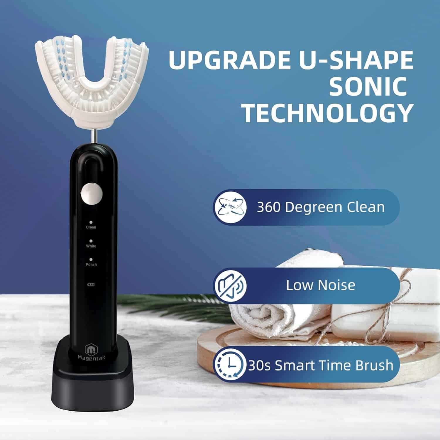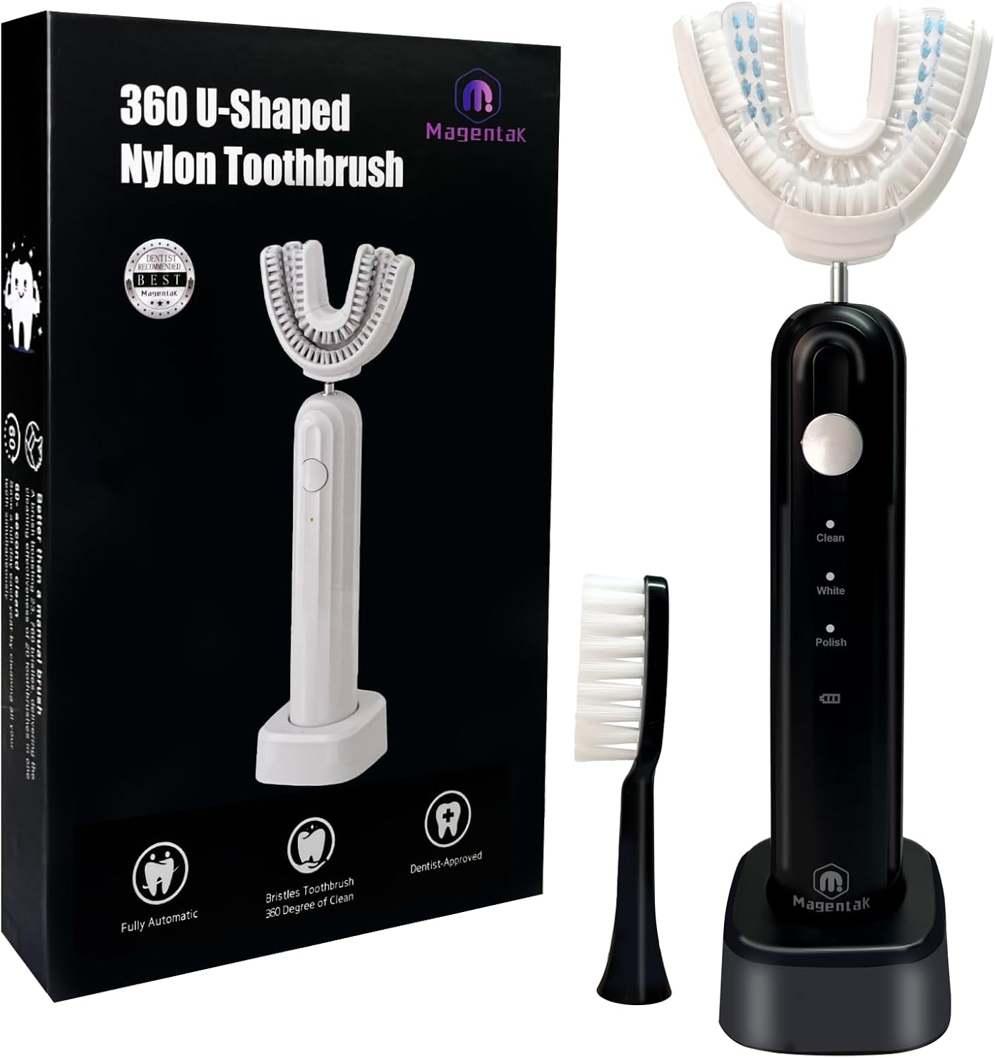 U Shaped Toothbrush: With a U shaped design that matches the shape of your teeth, this U-shaped toothbrush can reach your teeth 360 degree and clean your teeth with high-frequency sonic vibrations