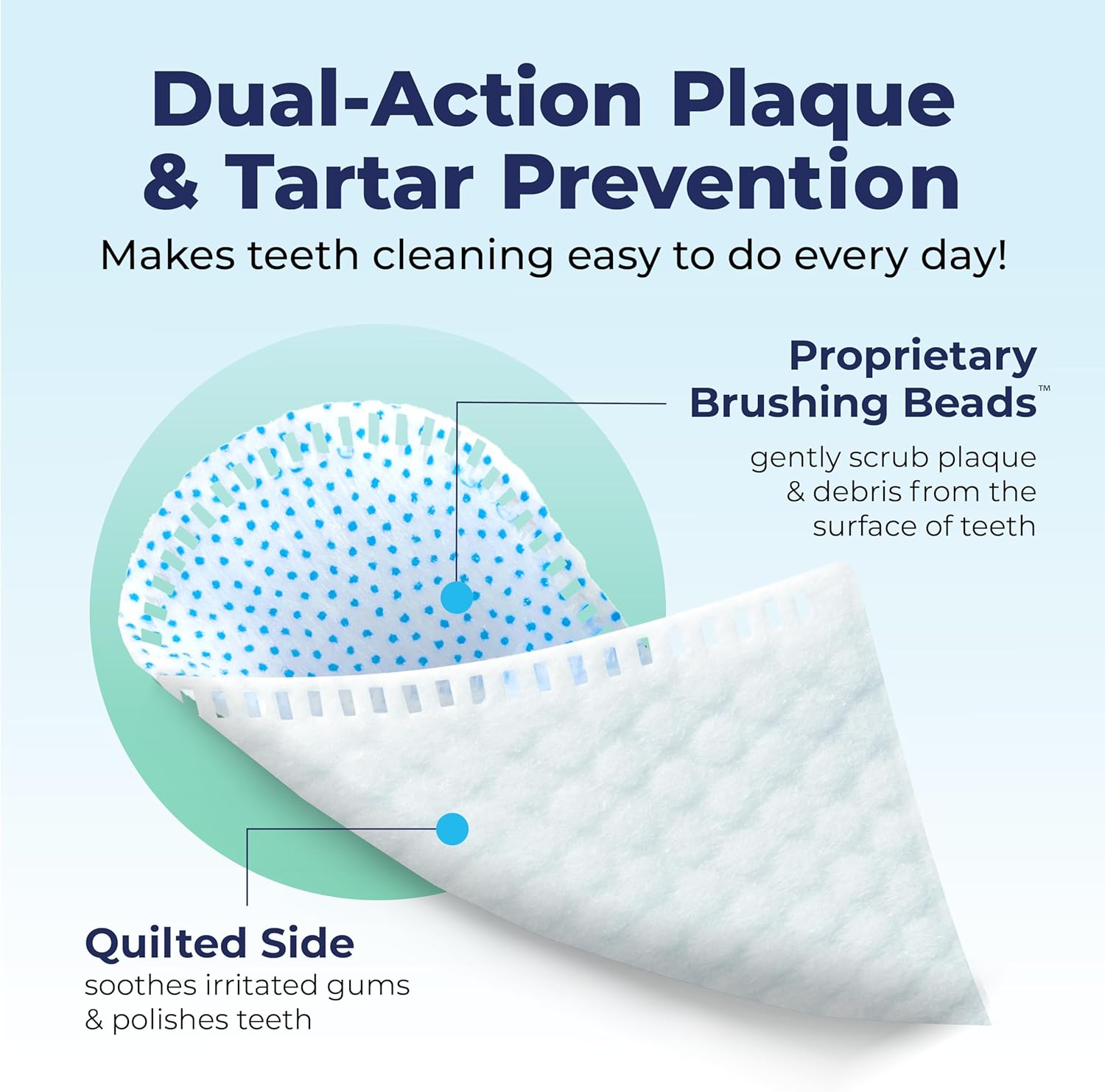 DUAL-ACTION MITT DOG PLAQUE AND TARTAR PREVENTION – Our dog dental wipes feature a bumpy side with Brushing Beads to remove plaque and prevent tartar from the tooth’s surface and a quilted side to polish and whiten teeth. They work better than dental chews for dogs!