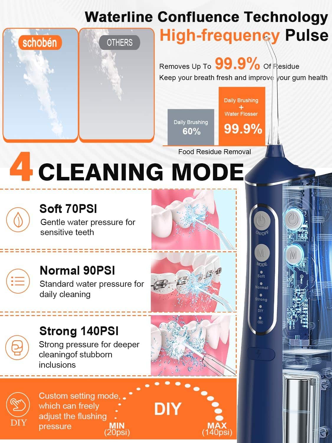 ❤😁【Shcoben Powerful Water Teeth Deep clean – 🤢Say NO to bad breath! 💋Keeps your oral fresh and whiten your teeth】With 1800 times/minute high pressure water pulse and 50-150 PSI water pressure can more efficiently remove food debris hidden deep and massage your gum, prevent teeth stain, bad breath and other oral problems.