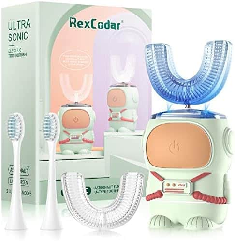Ultrasonic Kid’s U-Shaped Electric Toothbrush, IPX7 Waterproof, Five Cleaning Modes, 60S Smart Reminder (Cartoon Astronaut,Green Ages 6-12)
