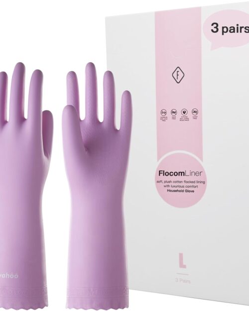wahoo 3 Pairs Skin-Friendly Cleaning Gloves, Reusable Dish Washing Gloves with Flocked Cotton Liner, Dishwashing, Kitchen, Mauve Mist, Medium
