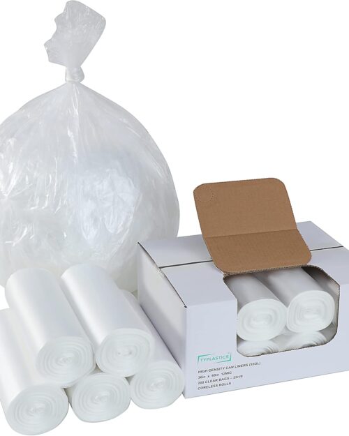 TYPLASTICS 55 Gallon Clear Trash Can Liners – 36″ x 60″ – High Density Garbage Bags – Case of 200 – Multipurpose for Office, Outdoor, Recycling, Industrial and Commercial