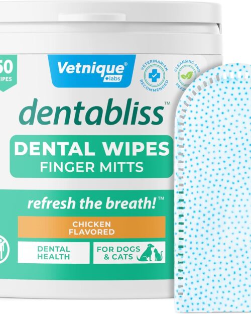 Vetnique Dentabliss – Dog Teeth Cleaning Finger Mitt Dental Wipe – Dog Plaque & Tartar Prevention with Brushing Beads – Flavored Dog Teeth Wipes, Dog Breath Freshener (Chicken)